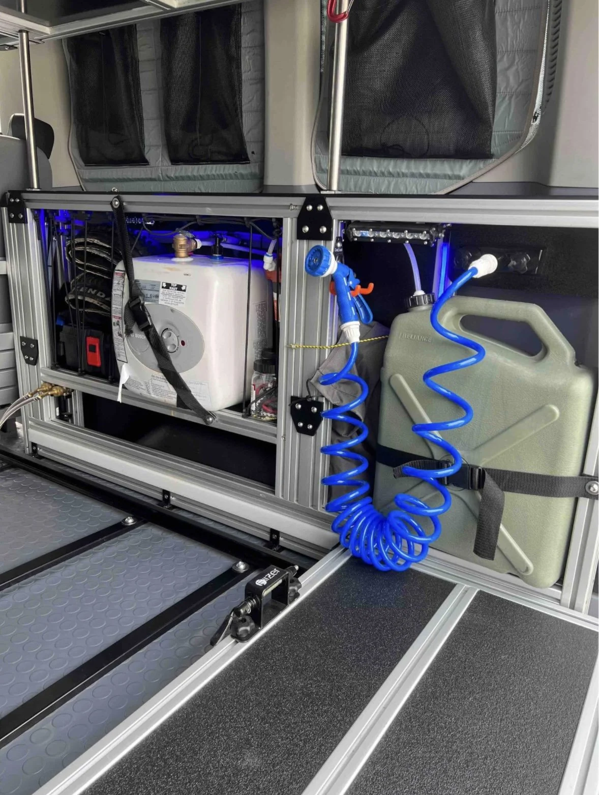 Your van comes equipped with a 6-gallon freshwater tank filled with filtered and softened potable water. This water supplies both the sink and the rear shower.